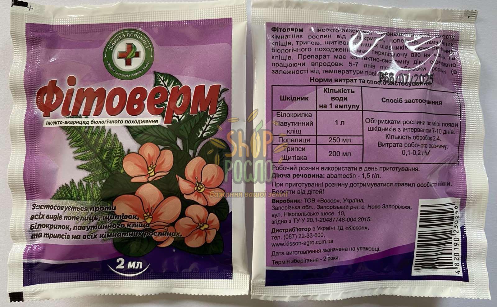 - На кімнатних рослинах від попелиці: 2 мл Фітоверму на 250 мл води, провести обприскування при появі шкідників.