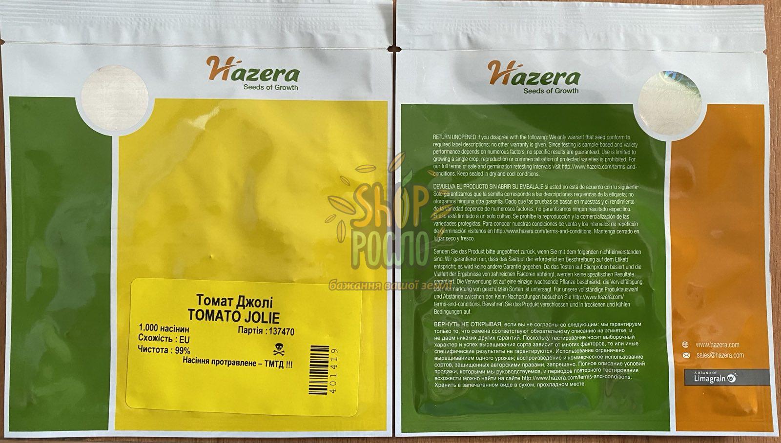 Джолі F1 – ранній високоврожайний гібрид детермінантного типу. Період вегетації – 70 днів від висадки розсади. Придатний для вирощування в закритому та відкритому ґрунті з використанням підв'язки та легко формується в 1-2 стебла. Демонструє відмінні результати при вирощуванні у відкритому ґрунті. Рослини дуже потужні, прямостоячі, з добре розвиненим листовим апаратом. Плоди сливовидні, великого розміру, діаметром 7,0-8,0 см, масою 160-180 г, вирівняні за розміром, насичено-рожевого кольору, протягом тривалого часу зберігають свої товарні та смакові якості. Чудова густина плодів дозволяє транспортувати їх на далекі відстані.