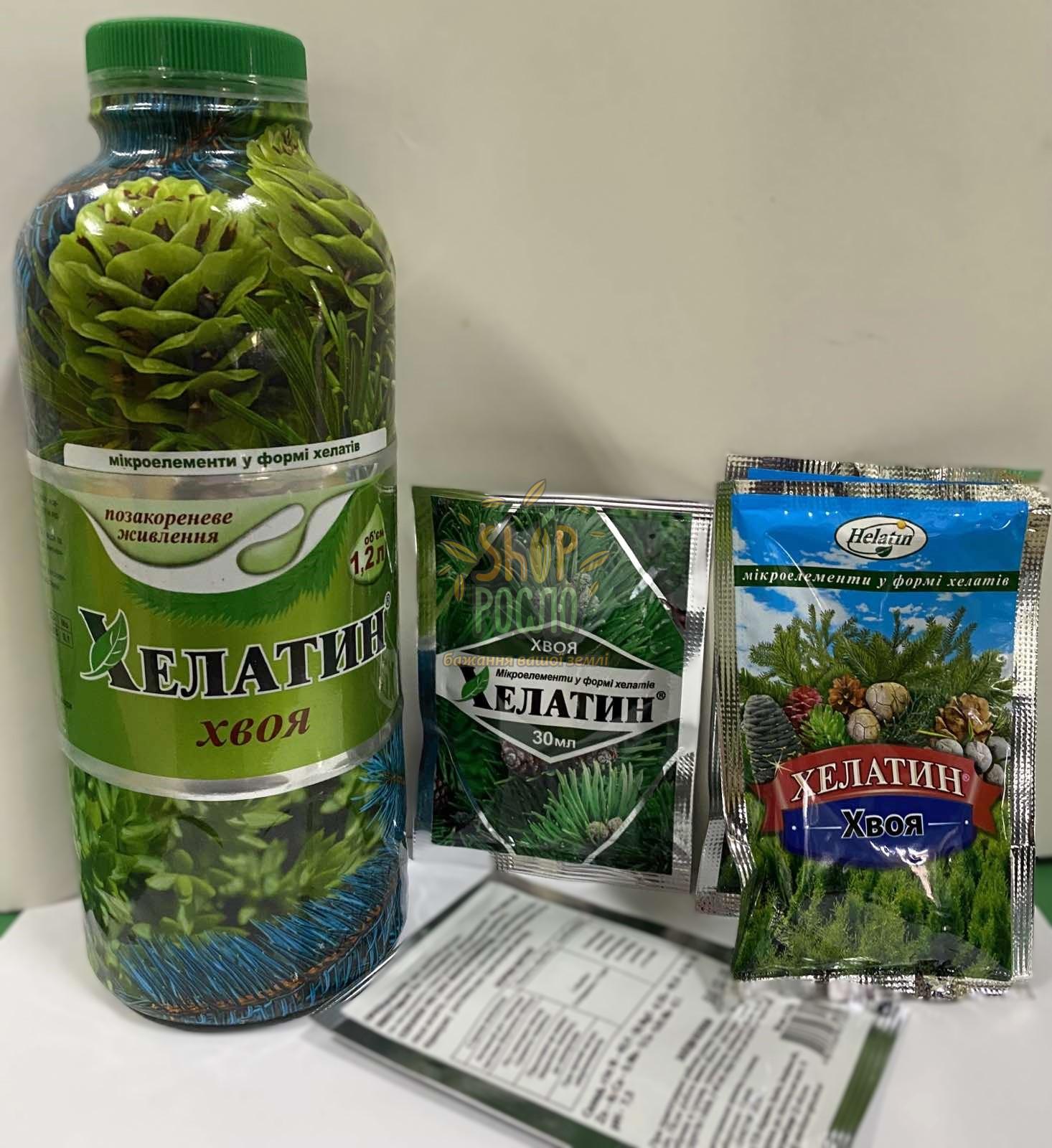 Хелатин – для успішного вирощування хвойних рослин та підтримки їхнього здоров'я важливу роль відіграє збалансоване мінеральне харчування. При дефіциті будь-якого елемента живлення спостерігається пожовтіння та подальше відмирання хвої, уповільнення росту рослини та її пригнічений зовнішній вигляд, порушення фізіологічних функцій. Мікроелементи підвищують стійкість рослини до багатьох захворювань, посилюють процеси запилення, плодоутворення, засвоєння поживних речовин. Крім того, вони стимулюють активність ферментних систем у рослинному організмі. За рахунок цього покращуються декоративні властивості рослин.