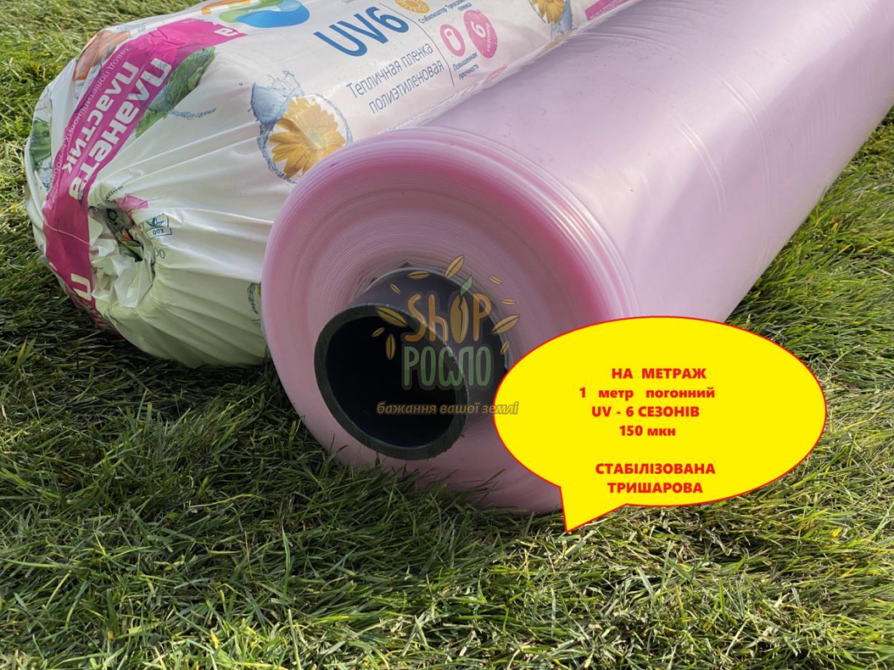 Плівка UV6-напіврукав рожевого кольору 150 мкм зі стабілізатором від впливу сонячних променів на 36 місяців, або 6 сезонів гарантійної експлуатації. Підвищена стійкість плівки до механічних пошкоджень + УФ-стабілізатор 36 місяців робить цей вид плівки універсальним. Використовують як основну плівку цілий рік для укриття теплиць та металевих конструкцій.