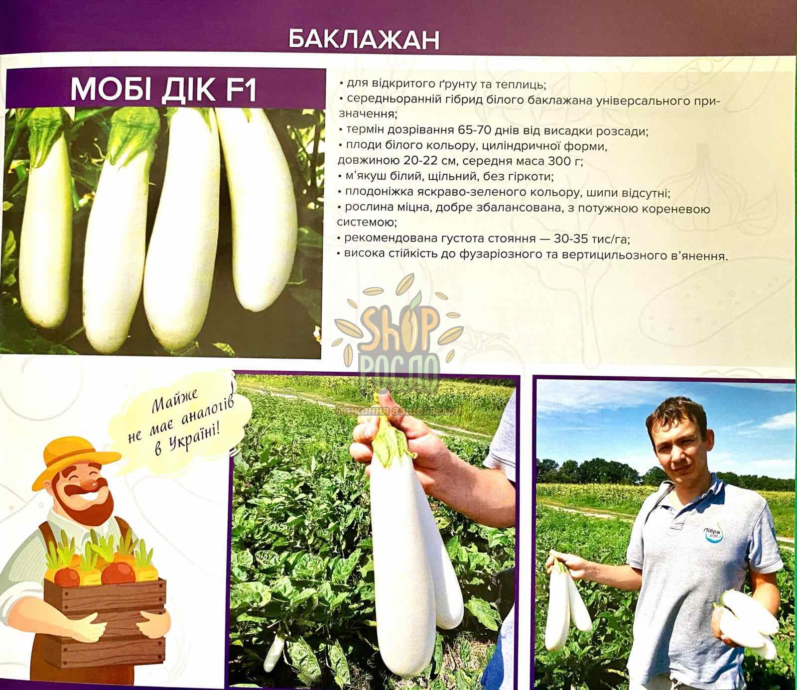 Ранній гібрид баклажану типу алмаз. Період вегетації: 65-70 днів. Гібрид не втрачає товарну продукцію – плоди великі, дуже щільні, з гарним смаком. Плоди циліндричної форми, довгі, дуже щільні та однорідні, колір білий із глянцем. Маса 180-230 грам. Довжина – 20-22 см.