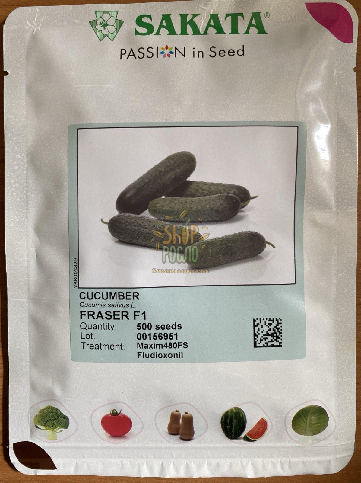 Фрейзер F1 – ультраранній партенокарпічний (самопильний) гібрид типу корнішон. Період вегетації: 33-37 днів із моменту посіву. Призначений для вирощування у захищеному та відкритому грунті. Рослина потужна і збалансована добре розвинена і продуктивна, з довгими пагонами і густим листям, короткими міжвузлями, утворює 2-3 плоди в кожному вузлі. Плід темно-зеленого кольору, дуже вирівняні, великогорбчасті масою 90-110 г довжиною 10-12 см. М'якуш хрумкий, ароматний без порожнеч. Смак насичений, насіннєва камера слабо розвинена. При переростанні не "бочкуються". Гібрид має високу стійкість до стресу та хвороб.