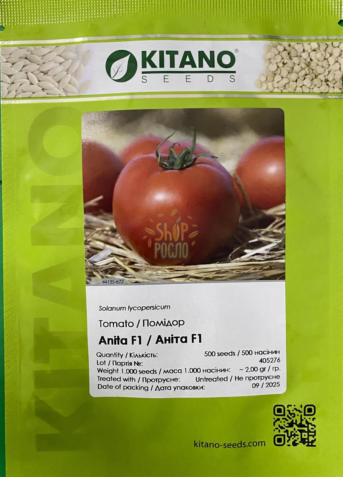 Детермінантний середньостиглий гібрид томату Аніта F1 призначений для вирощування у відкритому та закритому ґрунті. Рослина добре збалансована. Розвинений листовий апарат забезпечує захист від сонячних опікив. Потужна коренева система дає достатньо живлення навіть у несприятливих умовах. Має стійкість до фузаріозу (Fol: 0, 1), вірусу мозаїки, вірусу плямистого в'янення томатів (бронзової плямистої) та вертицильозу. Добре зав'язує плоди у несприятливих умовах. Плоди великі, яскраво-червоні зовні та всередині, цукрові на зламі, без зеленої плями біля плодоніжки. Добре зберігаються, не втрачаючи товарних якостей, добре витримують транспортування на тривалі відстані.