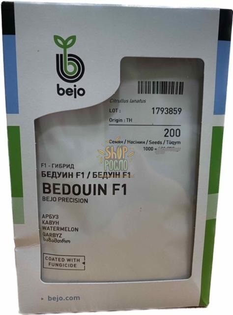 Гібрид кавуна Бедуїн F1 призначений для вирощування у відкритому ґрунті та плівкових тунелях. Підходить для всіх регіонів України. Рекомендована густота посадки – 6–7 тис. раст./га. Рослина середньої сили росту, плетиста, з потужною кореневою системою. Утворює 2-3 плоди на рослині. Демонструє стабільну врожайність. Плоди світло-зелені з темними смугами, округло-овальні, діаметром 25-30 см, вагою до 8-10 кг. М'якуш яскраво-червоний, соковитий, з дрібним темним насінням в невеликій кількості. Вміст цукру в м'якоті - 12-14%, що забезпечує чудовий солодкий смак. Плоди добре транспортуються та зберігають товарні якості до 14 днів. Підходять для нового ринку.