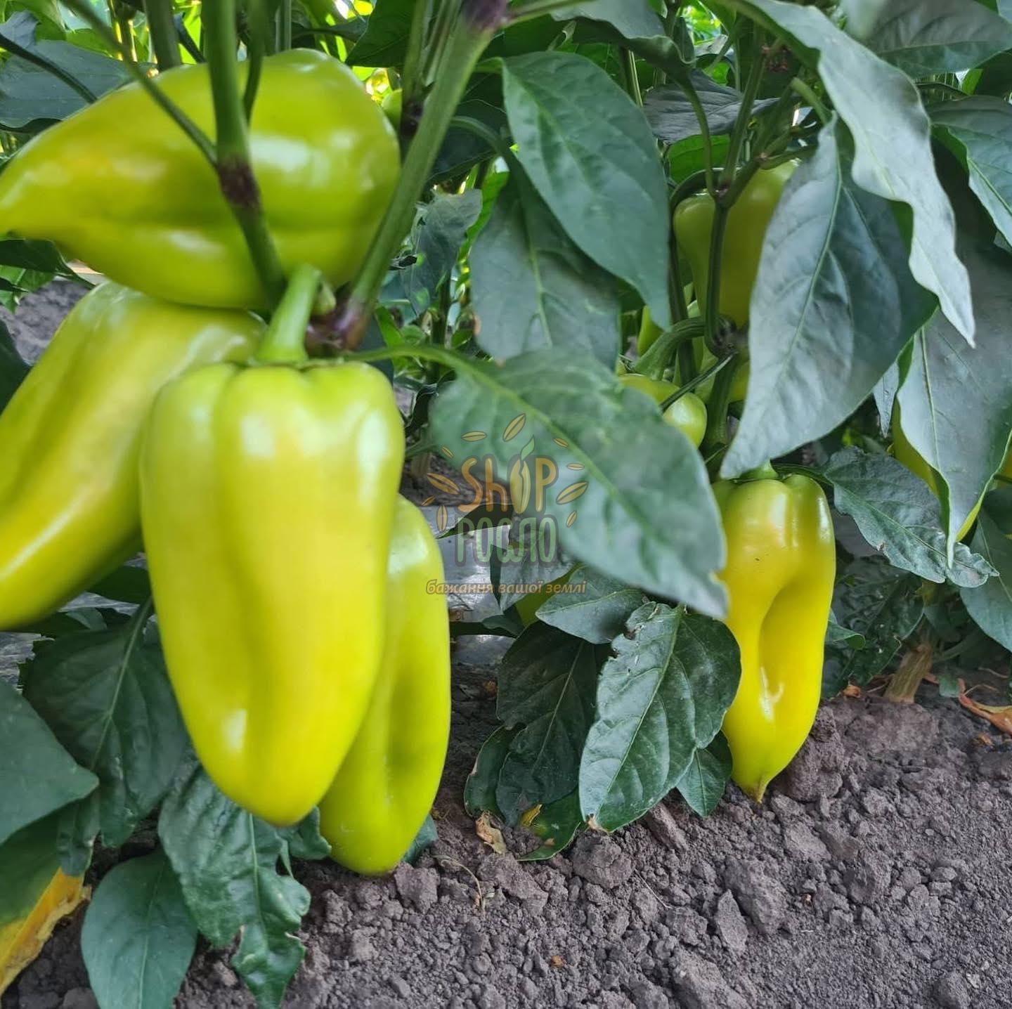 Плоды имеют форму широкого конуса, слегка закругленные с боков, 3-4 камерные. В технической спелости (110-120 дней) светло-зеленого цвета, толщина стенки 5-6 мм, в биологической (130-140 дней) становятся красными, толщина стенки 6-9 м. Обладают великолепным вкусом. Лежкость отличная, при хранении не снижаются вкусовые и товарные качества.